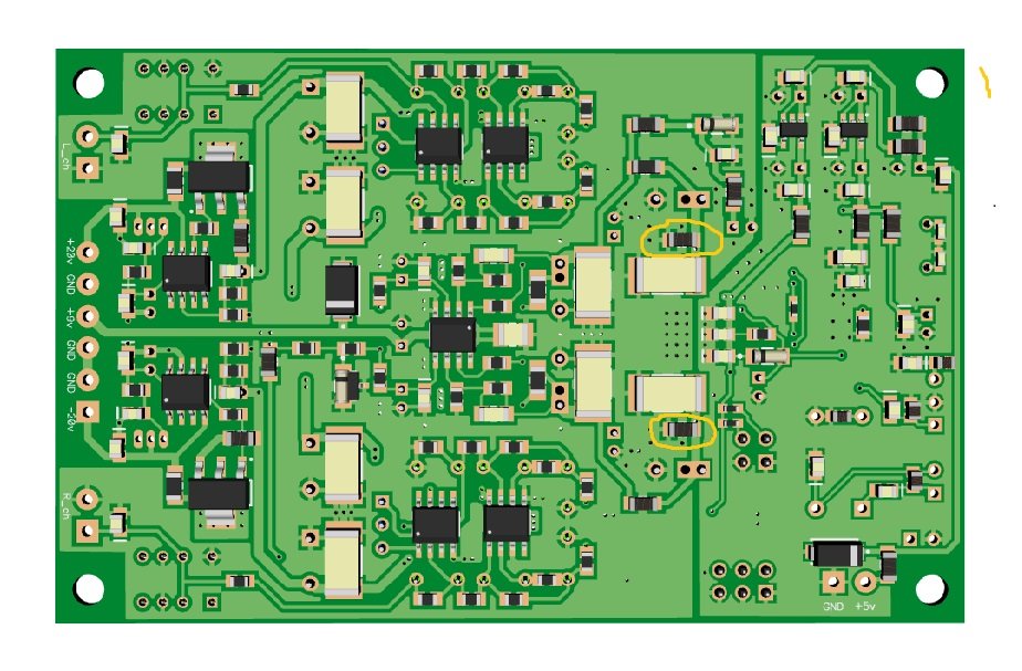 В ФНЧ предлагается использовать сдвоенные ОУ: OPA1642, OPA1652, AD823, LME49720, LT1364, LME49880 и ADA4898-2, последние две имеют Thermal Pad, и требуют обязательной его пропайки для отвода тепла на плату. В звено вычитателя дифференциальных сигналов предлагается использовать высколинейные ОУ: ADA4627, OP42, OPA627, LT1468. Цепочка точной подстройки нуля на выходе вычитателя должна быть скорректирована согласно даташиту для выбранного ОУ. Печатная плата предусматривает достаточную свободу в ее реализации.