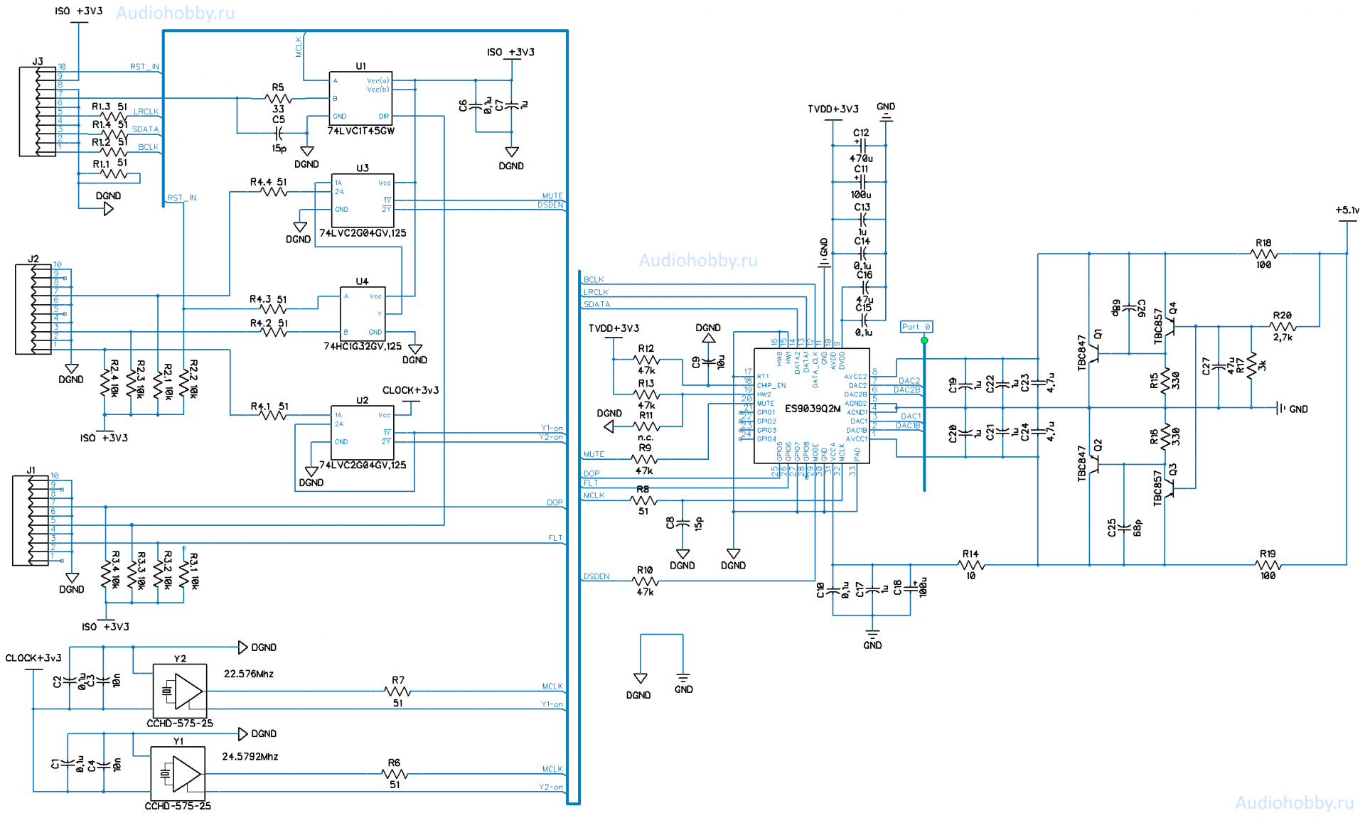 Для питания тактовых генераторов и линии AVDD применяются низкошумящие LDO стабилизаторы LP5907-3.3. Так как питание цифровой частиES9039Q2M формирутеся внутренним LDO изAVDD, то это создает излишние помехи для AVDD . Для борьбы с этим негативым явлением, предлагается в качестве С11 гибридную емкость (panasonic серии ZA), которой в параллель рекомендуется установить полимер С12 с максимально низким ESR.