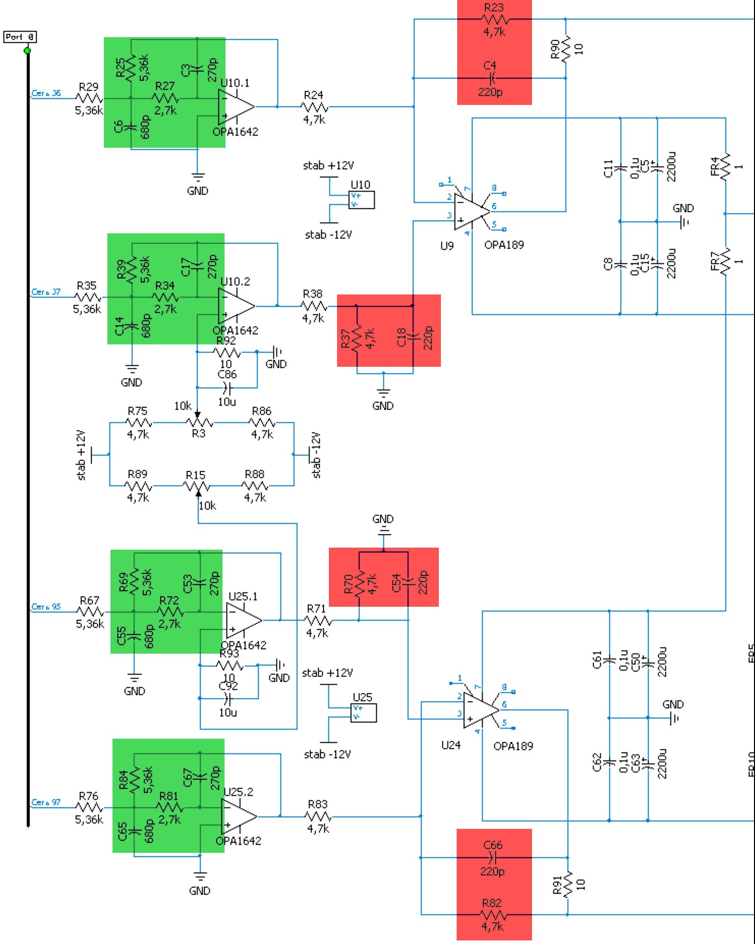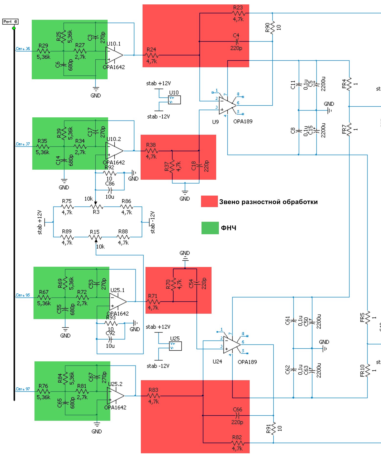 В ФНЧ предлагается использовать высококачественные стерео ОУ: OPA2810, OPA1656(OPA2156), OPA2189, OPA1642 (полные аналоги OPA2141 и прецизионный OPA2140), THS4062, LME49880 с несколько худшими результатами в порядке убывания AD8066, AD823, OPA1652, ADA4610-2, OPA2132, OPA2134. В звено вычитателя дифференциальных сигналов можно установить следующие ОУ: OPA828, OPA189, OPA1641, LT1122, OPA211, AD797, OPA627, OP42, ADA4627, OPA827, AD825, ADA4610-1, ADA4898-1, LT1468, OPA134.