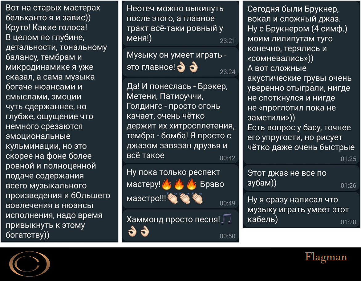 Потрясающая сцена, прозрачность, собранность, телесность, музыкальность и эмоциональность при ЛЮБОМ ЖАНРОВОМ ИСПОЛНЕНИИ не зависимо от уровня громкости.