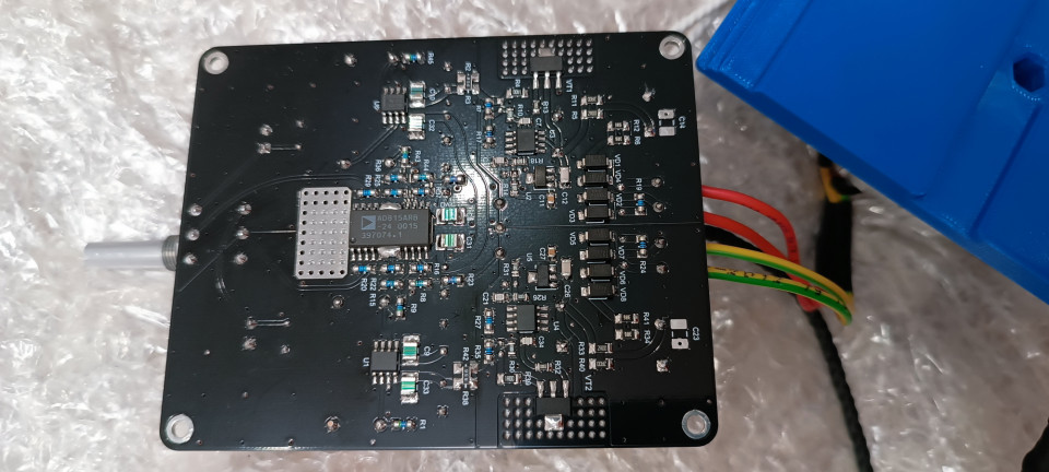 Усилитель собран на AD815 с интегратором на операционных усилителях OPA828 и конденсаторов WIMA MKP4. Схемотехника питания взята из схемы питания выхлопа ЦАП AH-D6.1 (м/с OPA1641, BCP56/53 и ИОН на 7805/7905). Используются электролитические конденсаторы Nichicon UFW, UKA, UPW, плёночные конденсаторы WIMA MKP4 и Panasonic ECPU1C105MA5. В питании используются диоды Шоттки.