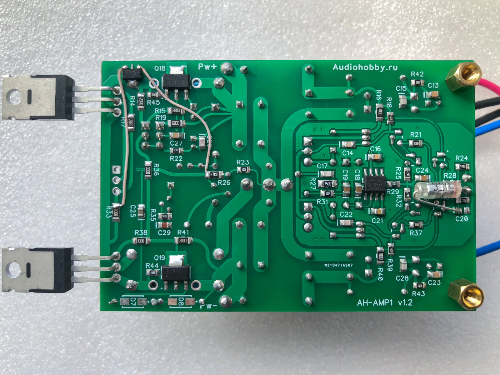 Собрал сегодня я стенд для проверки на пригодность скопившееся у меня транзисторы в качестве Q9, для этого замечательного УНЧ! Вот после продолжительного и внимательного прослушивания разных треков и жанров мой выбор пал пока только на два варианта - 2SD2544 и 2SC3944 звучат чуть по разному но оба мне понравились. Ток покоя 800мА, Q5,Q6,Q14,Q15 запаяны - 2SA1318U/2SC3331U Sanyo 50v 200мА нагрев маленький.