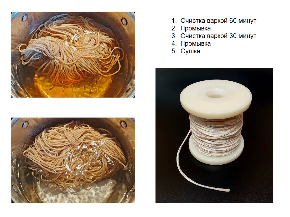 6. Провариваем хлопок от технических масел 2 раза, это важно! 1 раз 60 минут, сливаем грязную, пивного цвета воду, промываем чулок и провариваем еще 30 минут. После промывки ОБЯЗАТЕЛЬНО! растягиваем по длине и сушим (можно/лучше растянуть на бельевую сушилку).