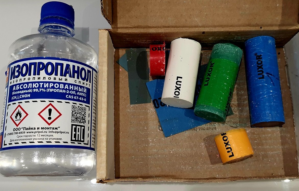 16. Подготавливаем спирто-канифоль — растворяем порошок канифоли в изопропиловом спирте до нужной консистенции. Обрабатываем концы проводников.